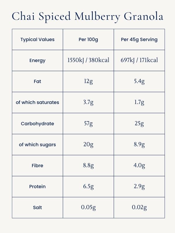 Choose from 450g (10 servings), 1 kilo (22 servings) or 2 kilosĀ (44 servings) of fresh Chai Spiced Mulberry granola,Ā baked at our cereal bakery in Bermondsey. The best quality shelf life is 4 months, once open, it can be stored in the freezer or decanted into an airtight jar to keep fresh for a long time.
