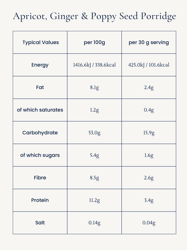 Ingredients: Gluten-free porridge oats, apricot chunks (Sulphur Dioxide), ginger, coconut blossom sugar, rose salt, poppy seeds. Allergens in bold.