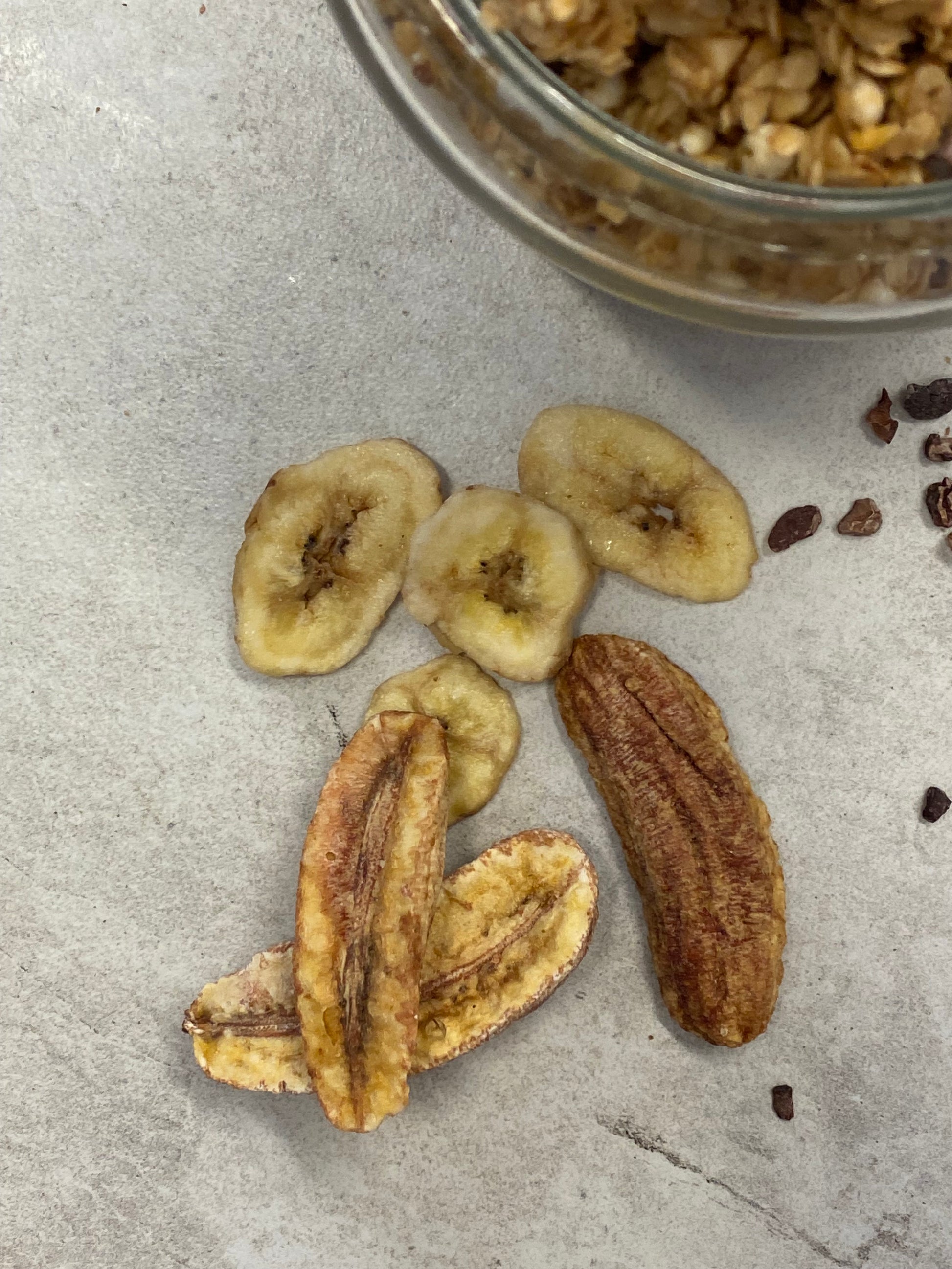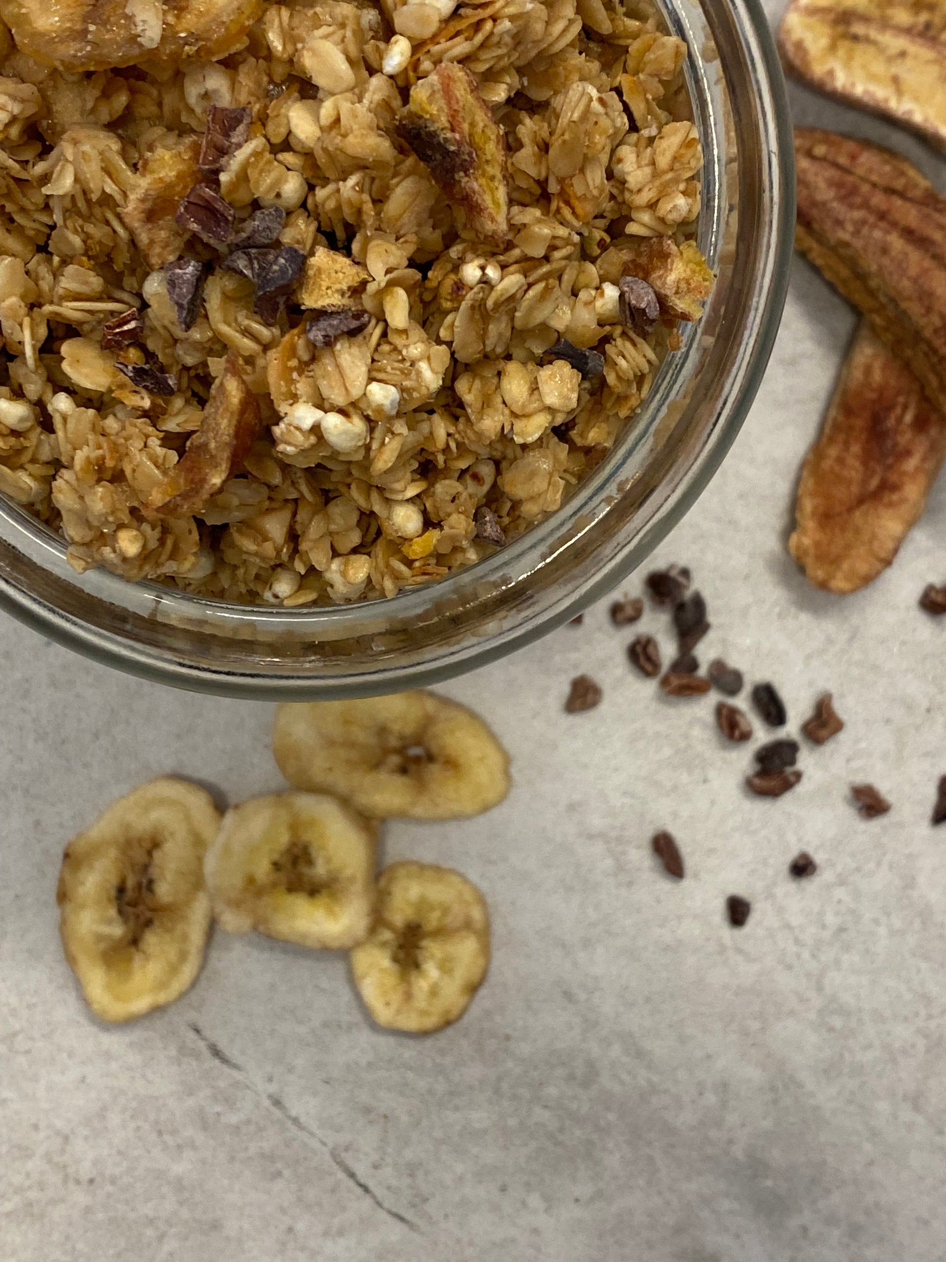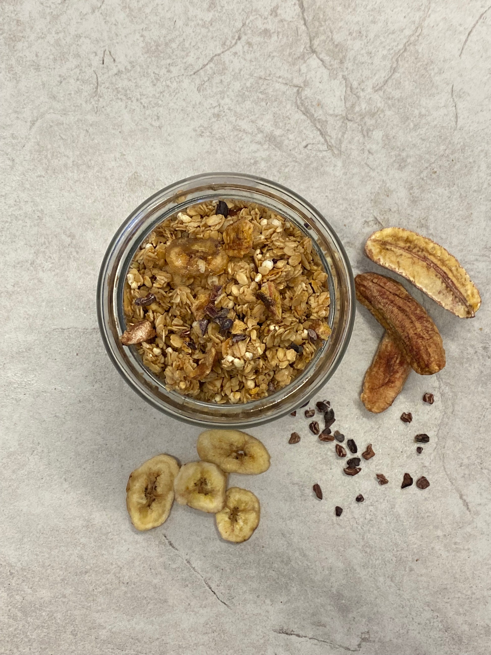 Ingredients: Jumbo Oats (gf), wildflower honey, rapeseed oil, pecan nuts, coconut flakes, cacao nibs, banana chips, freeze dried banana, sun dried banana, ground nutmeg, ground cinnamon, ground ginger, Himalayan salt.