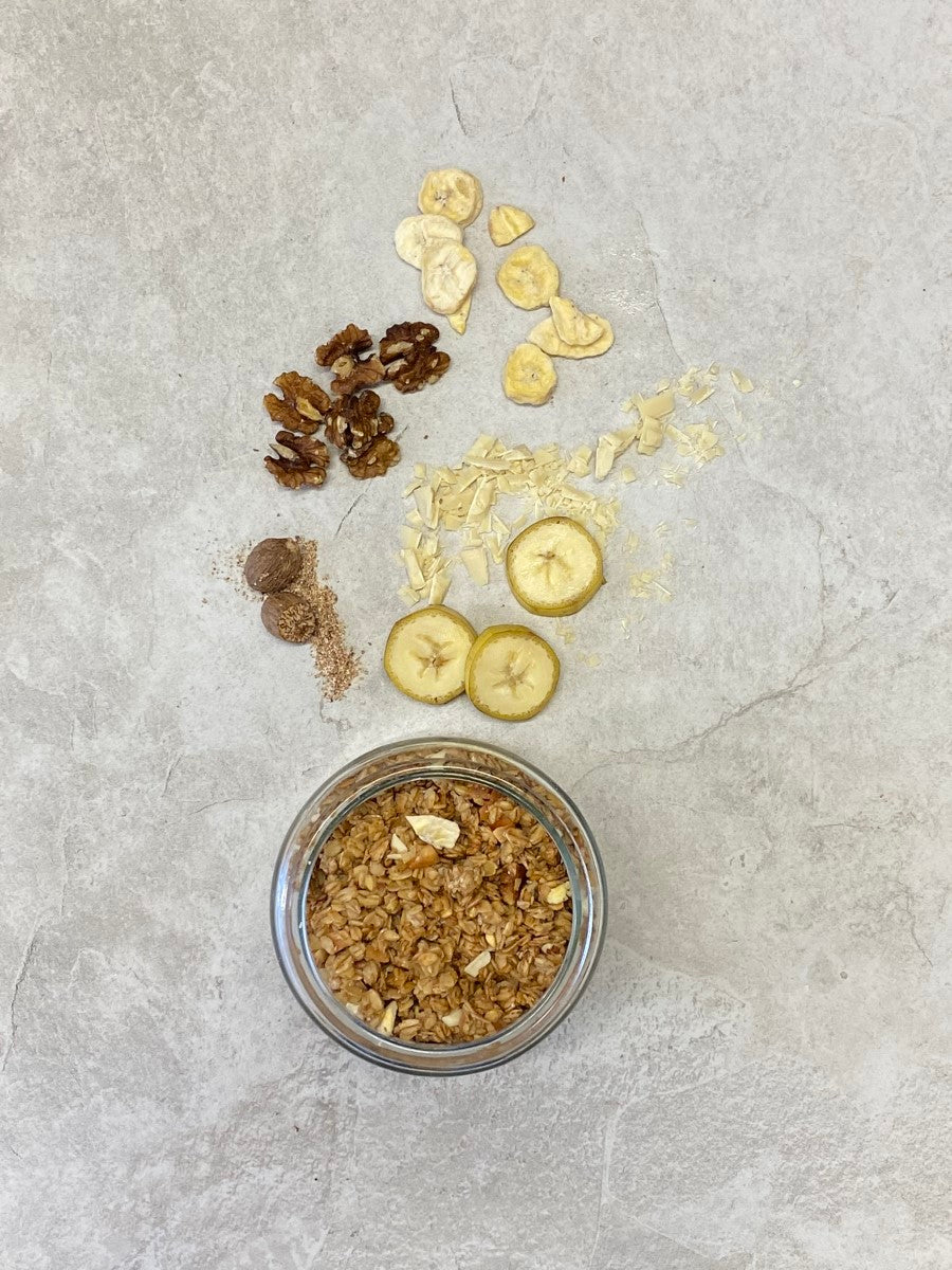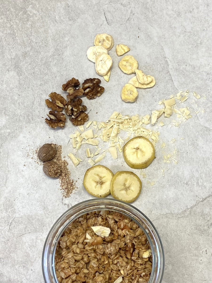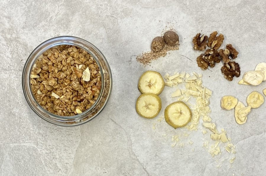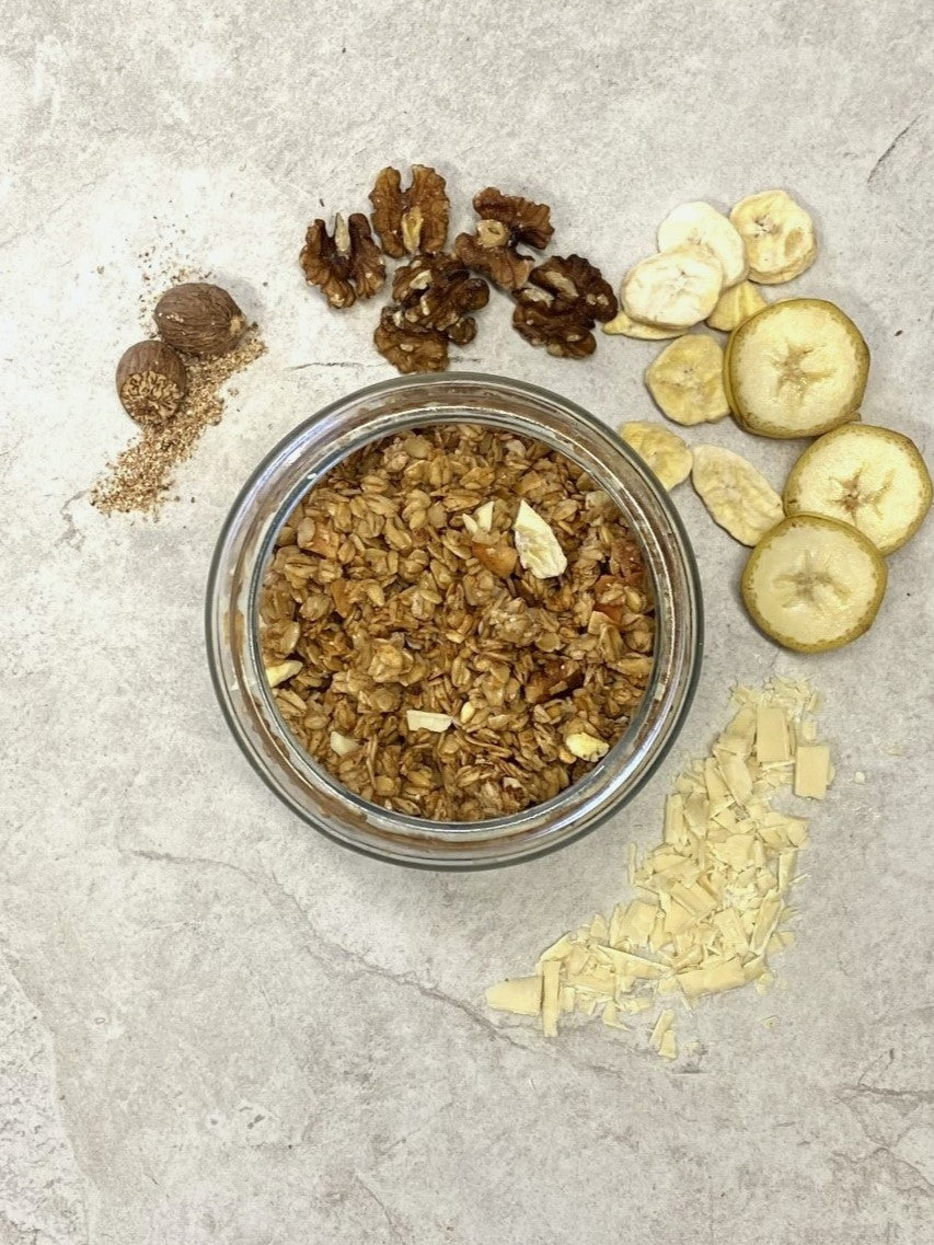 Ingredients: Jumbo oats (gf), rapeseed oil, wildflower honey, walnut (nuts), fresh banana (fresh), coconut flakes, white chocolate (Mayan Red 40% from Xoco Chocolate), freeze dried banana pieces, desiccated coconut, coconut sugar, nutmeg, cinnamon, Himalayan salt.