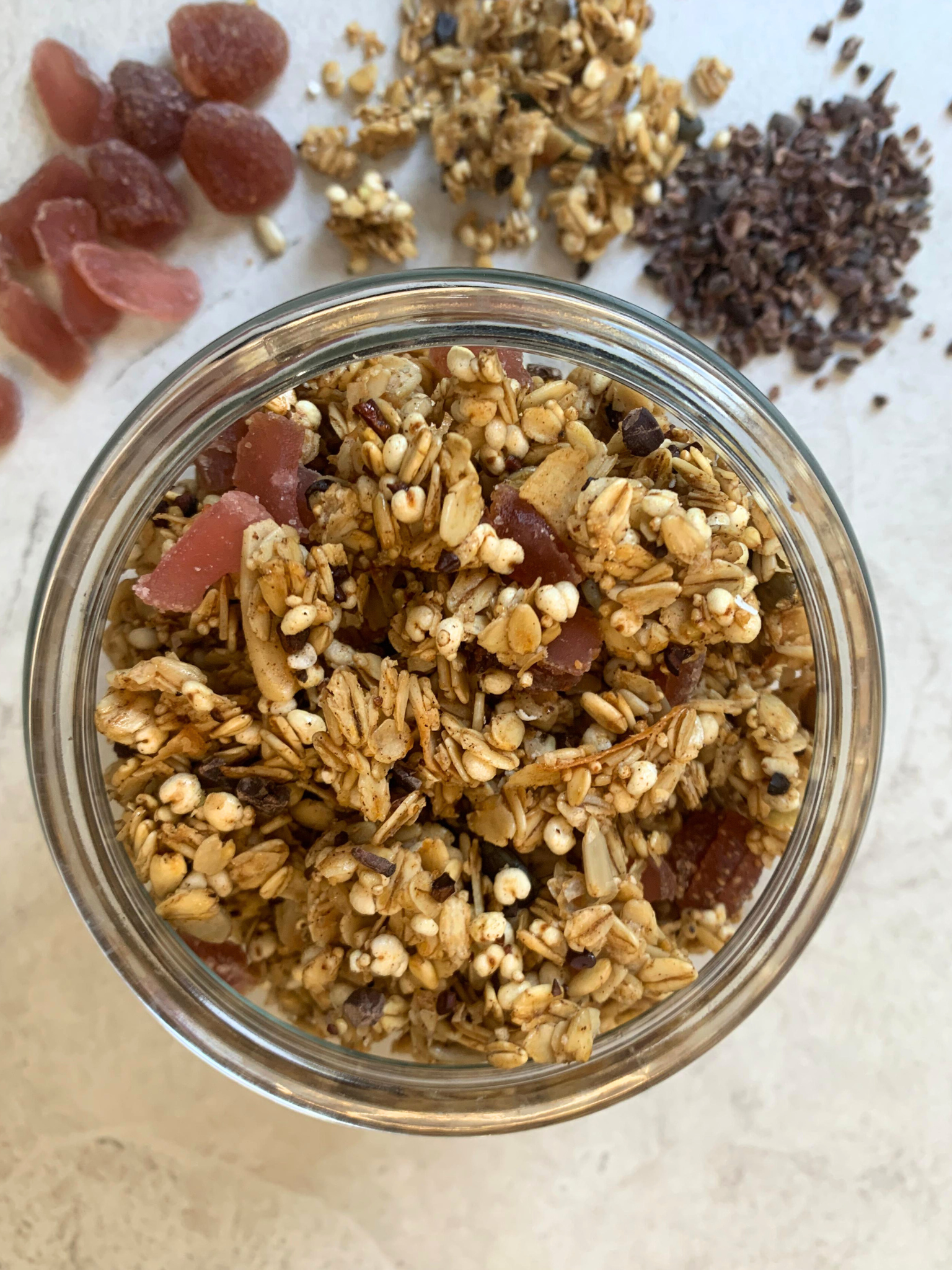A sunny morning in a bowl. This is granola in duet form: the bright, jammy tang of strawberries paired with the deep, bittersweet crunch of cacao nibs.