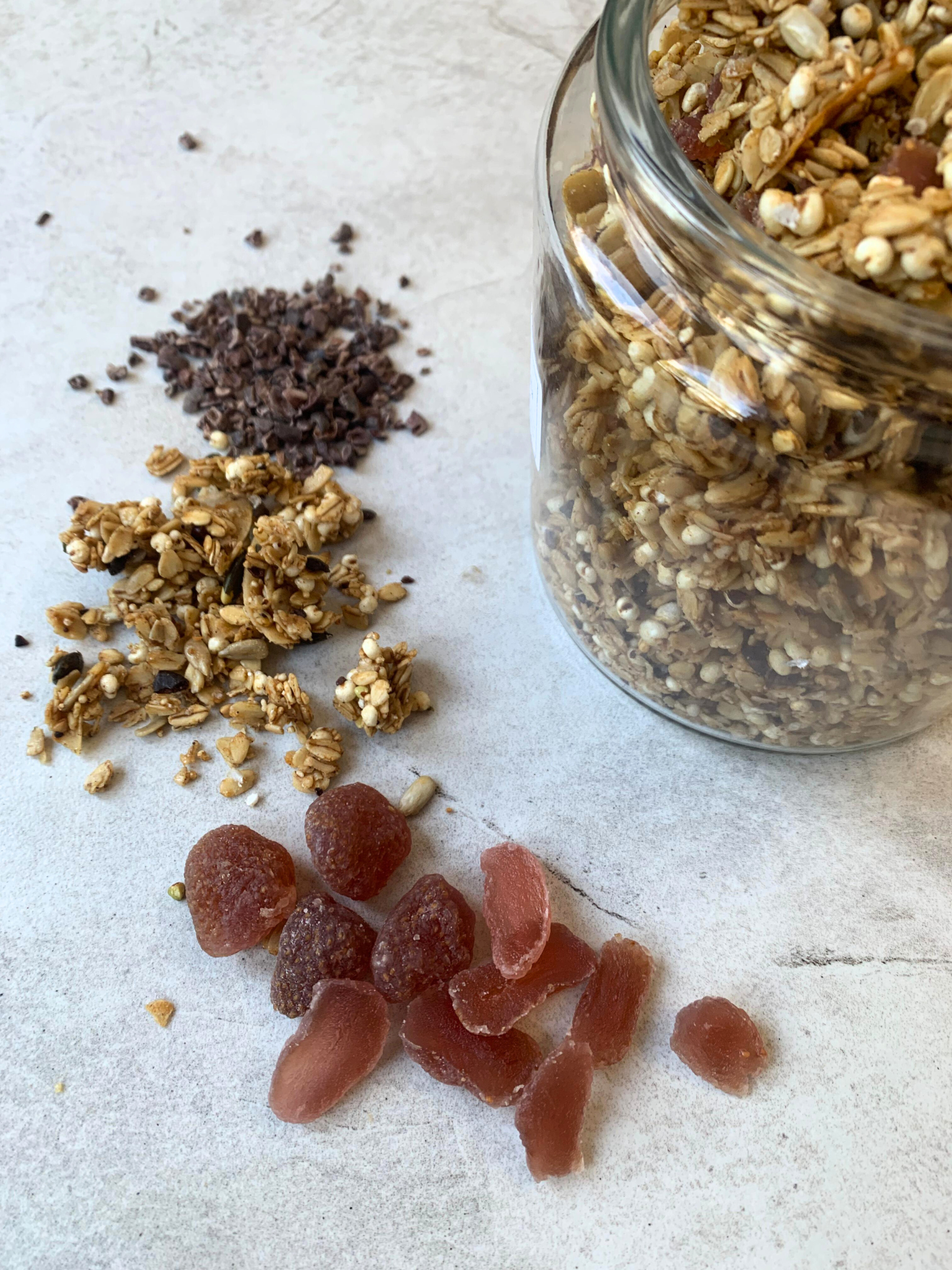 Jumbo oats, Rapeseed oil, Wildflower honey, Puffed millet, Flaked coconut, Pumpkin seeds, Sunflower seeds, Hulled buckwheat, Dried chopped strawberries (sulphites), Cacao nibs, Puffed amaranth, Ground cinnamon, Ground ginger, Himalayan pink salt.