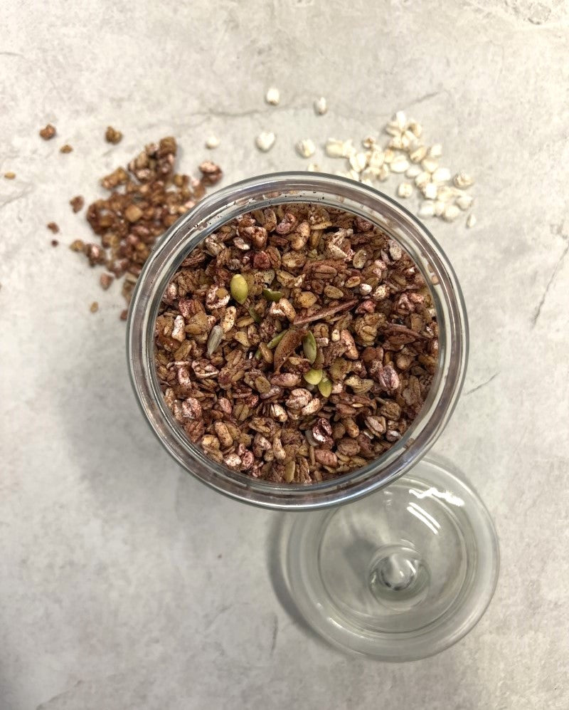 Under the tart-sweet kick of Haskap berry powder, we've layered a medley of seeds; hemp, pumpkin, sunflower, black sesame and poppy and packed it with toasted coconut chips and sweet jammy fig chunks. Puffed grains bring a lovely texture to the base of hearty oats, all mixed up with wildflower honey and toasted with a pinch of rock salt.