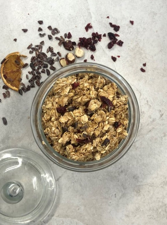IngredientsGluten free jumbo oats, wildflower honey, rapeseed oil, hazelnuts, puffed amaranth, cranberries, cacao nibs, orange blossom water, orange flakes, ginger, cinnamon, sea salt.