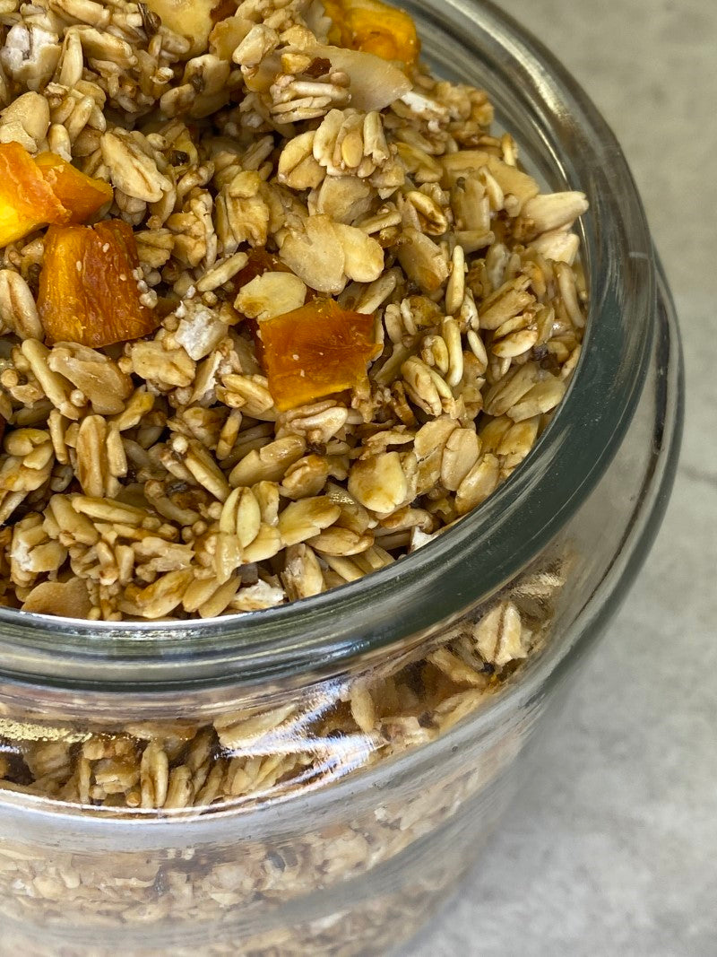 Chewy pieces of dried mango with ribbons of coconut and crunchy chunks of house-roasted almonds dance through a fragrant bed of honey & vanilla coated jumbo oats. Vanilla and wildflower honey work together to lend a delicate aroma and gentle sweet flavour to the oats.
