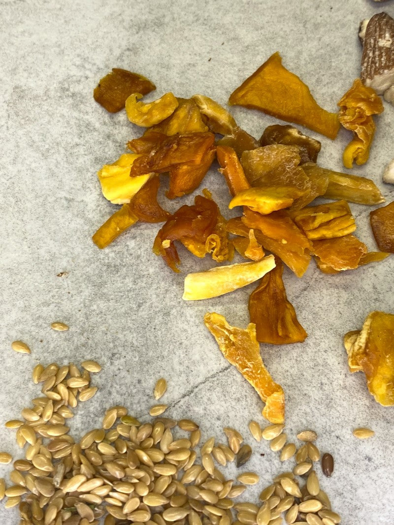 Its all too easy to pick out the tasty mango pieces, but we do recommend will power - its a fantastically balanced granola altogether and has been designed for a texture and flavour that pairs perfectly with natural live yoghurt (the thin kind that you find at a local farmers market is ideal).