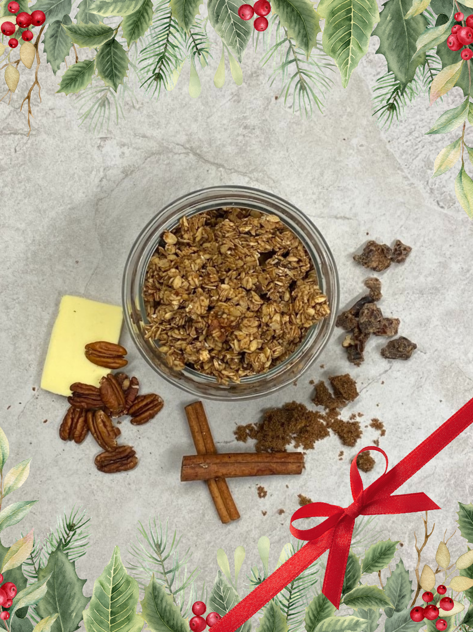 Jumbo oats, brown sugar, salted butter (dairy), rapeseed oil, dates, wildflower honey, coconut sugar, pecans (nuts), cinnamon, ginger, brandy, vanilla essence, clove, Himalayan salt. Allergens in bold.