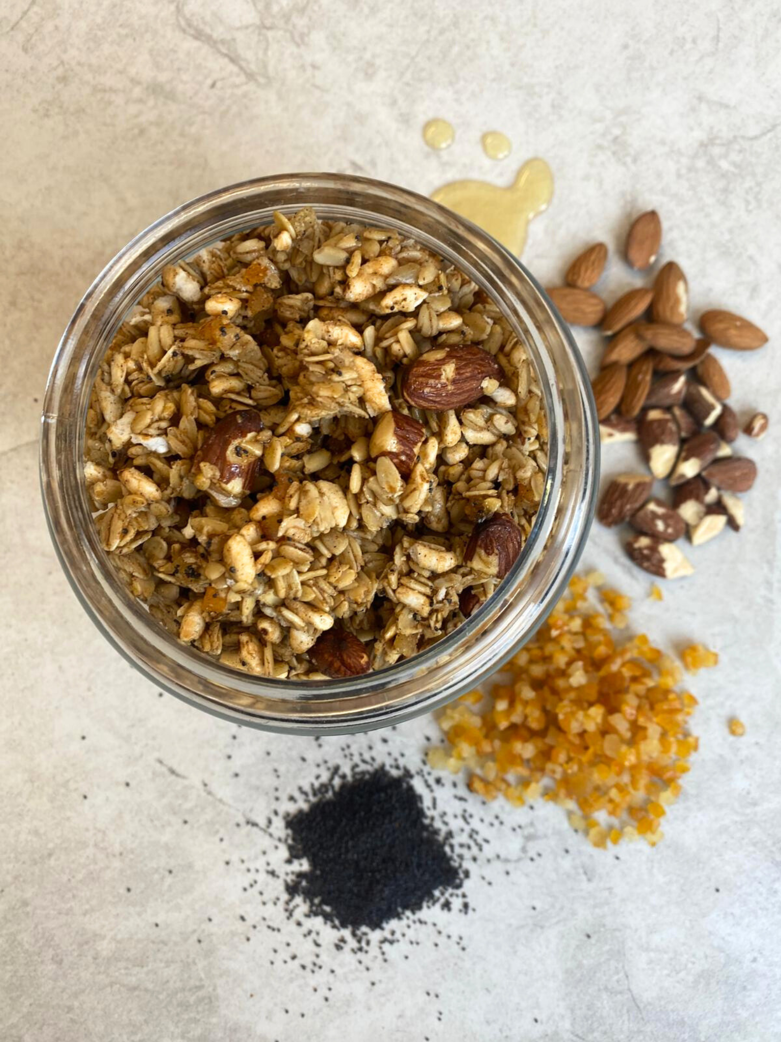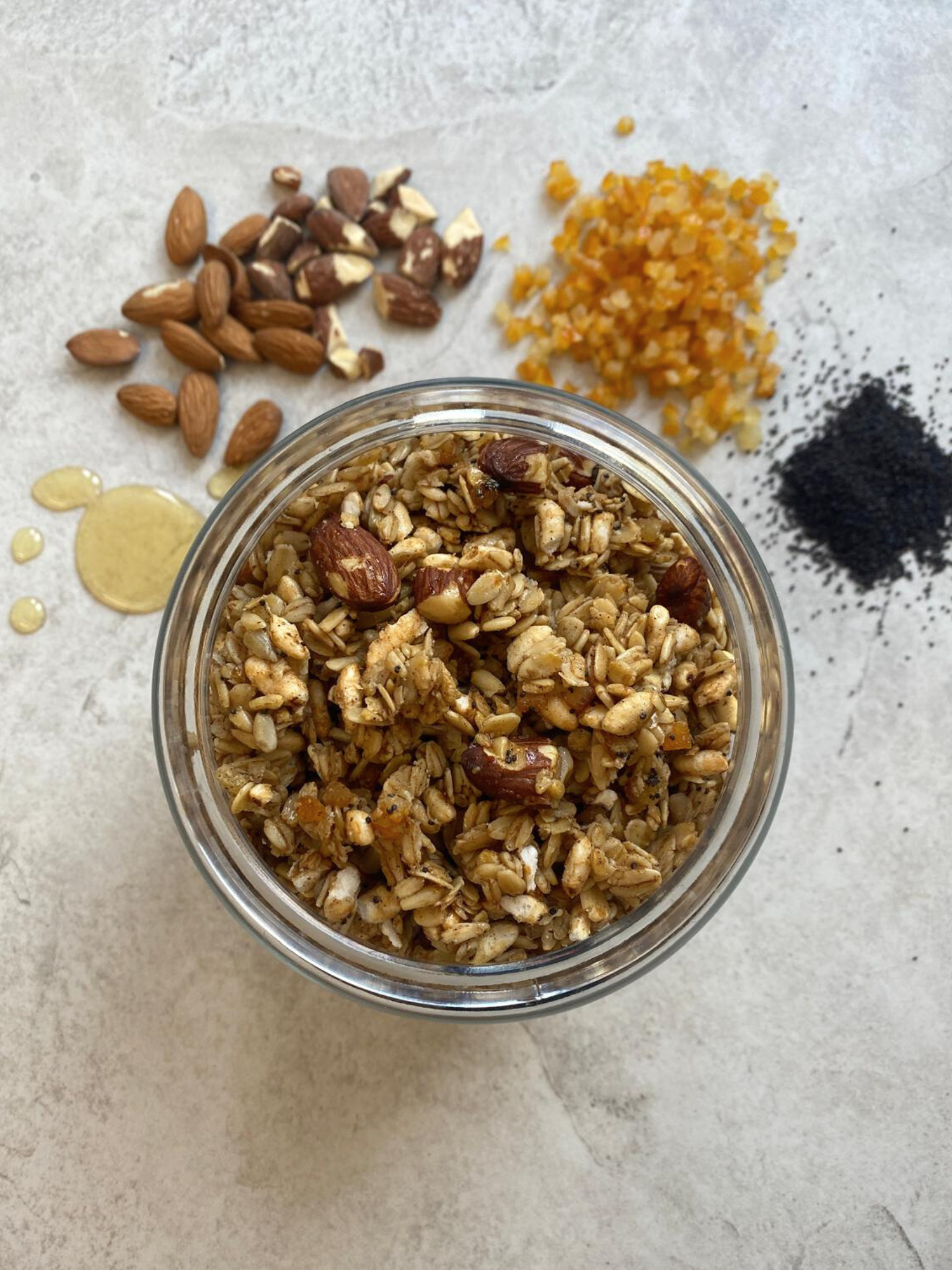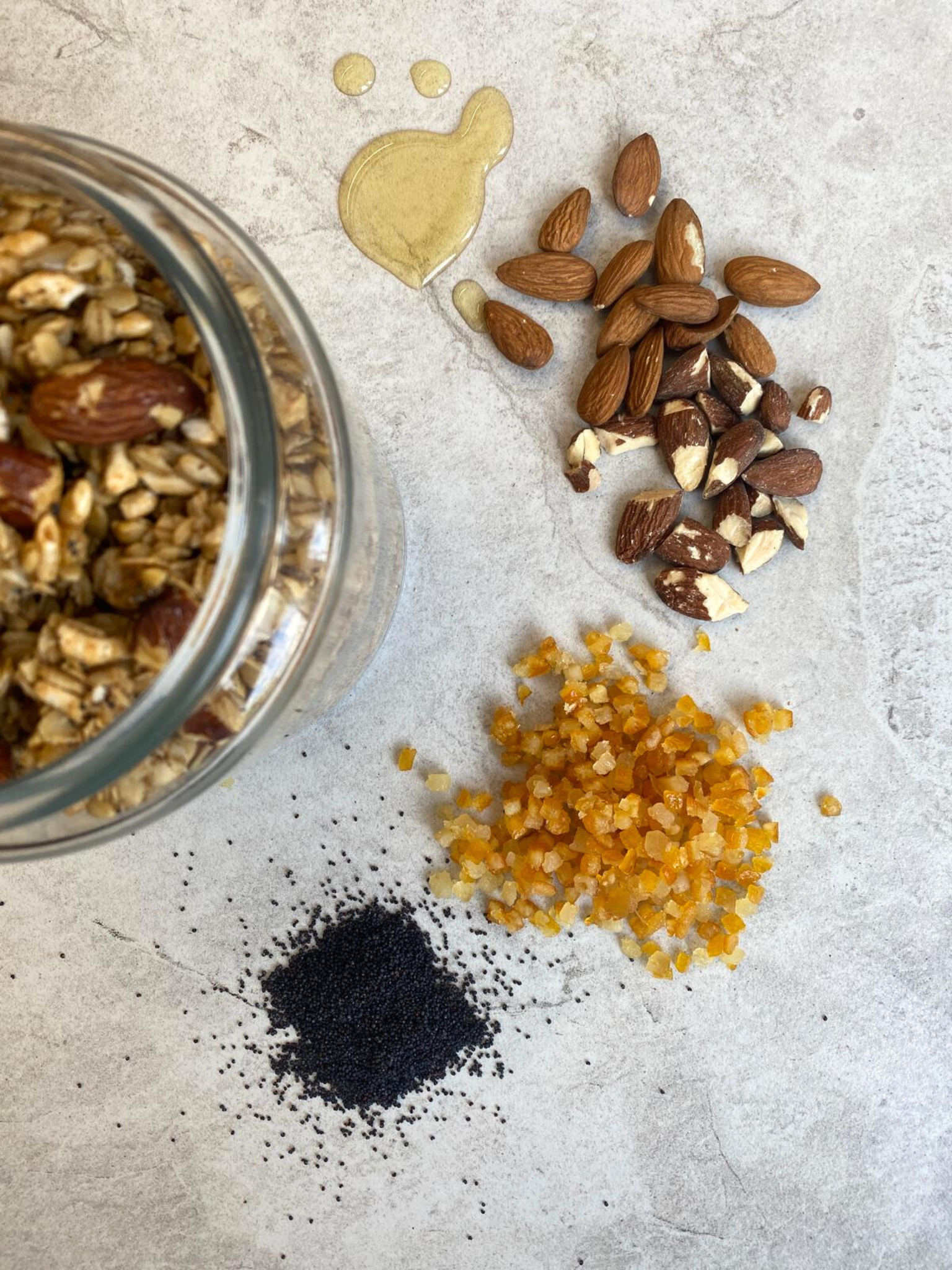 Ingredients: Oats, Rapeseed oil, Wildflower honey, Roasted almonds, Candied orange and lemon peel, Puffed rice, Sunflower seeds, Coconut pulp, Orange essence, Almond essence, Poppy seeds, Ground cinnamon, Ground clove, Himalayan pink salt.