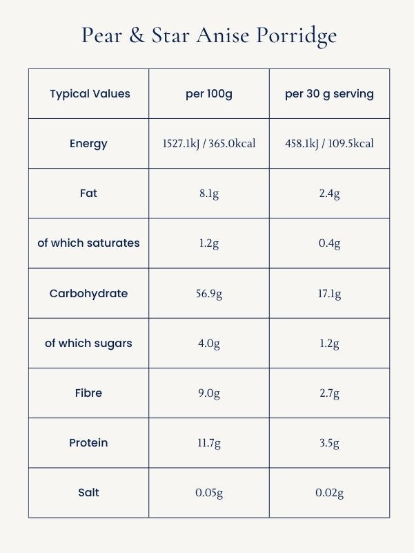 Ingredients: Gluten-free porridge oats, pear (Sulphur Dioxide), star anise, cinnamon, clove, ground nutmeg, coconut blossom sugar, rose salt. Allergens in bold.
