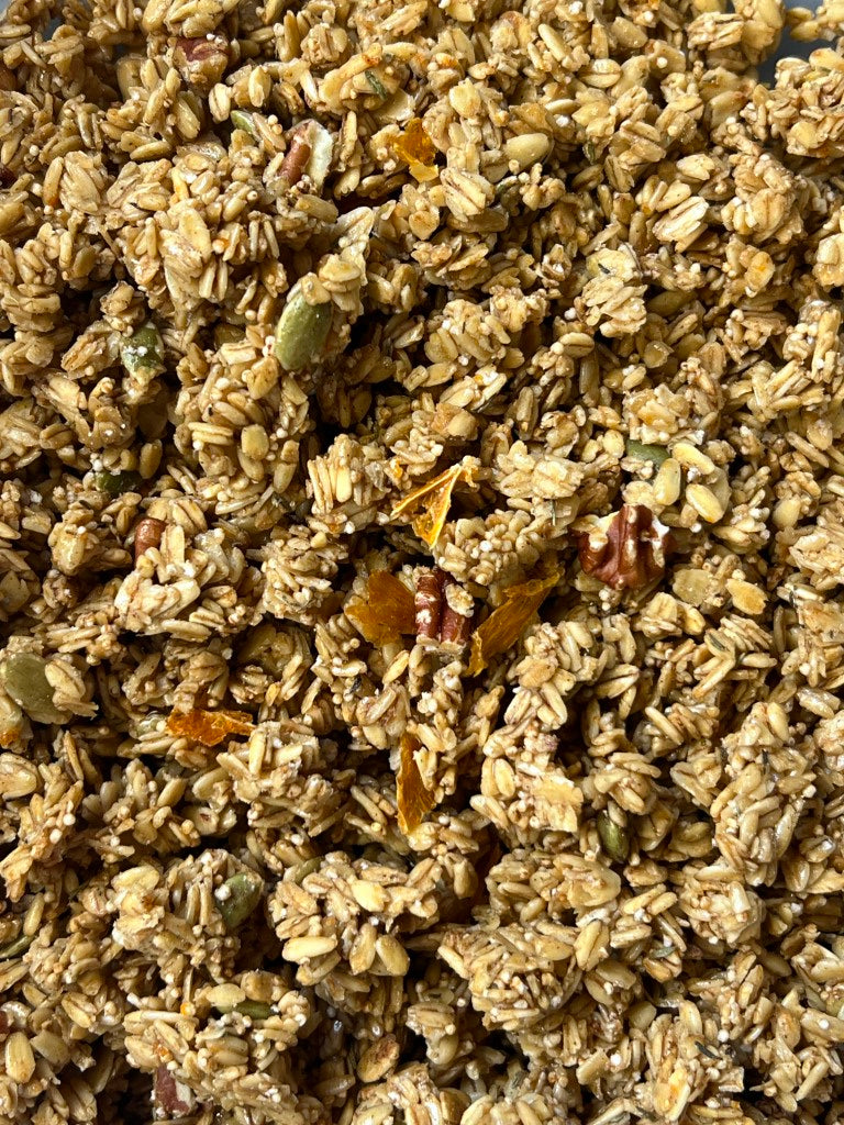 Containing but not limited to...Ā Jumbo oats, puffed amaranth, pumpkin seeds, pecan nuts (NUTS!), wildflower honey, rapeseed oil, dried thyme, dried thyme infused in honey, orange zest, dehydrated orange flakes, Himalayan salt. Allergens in bold.