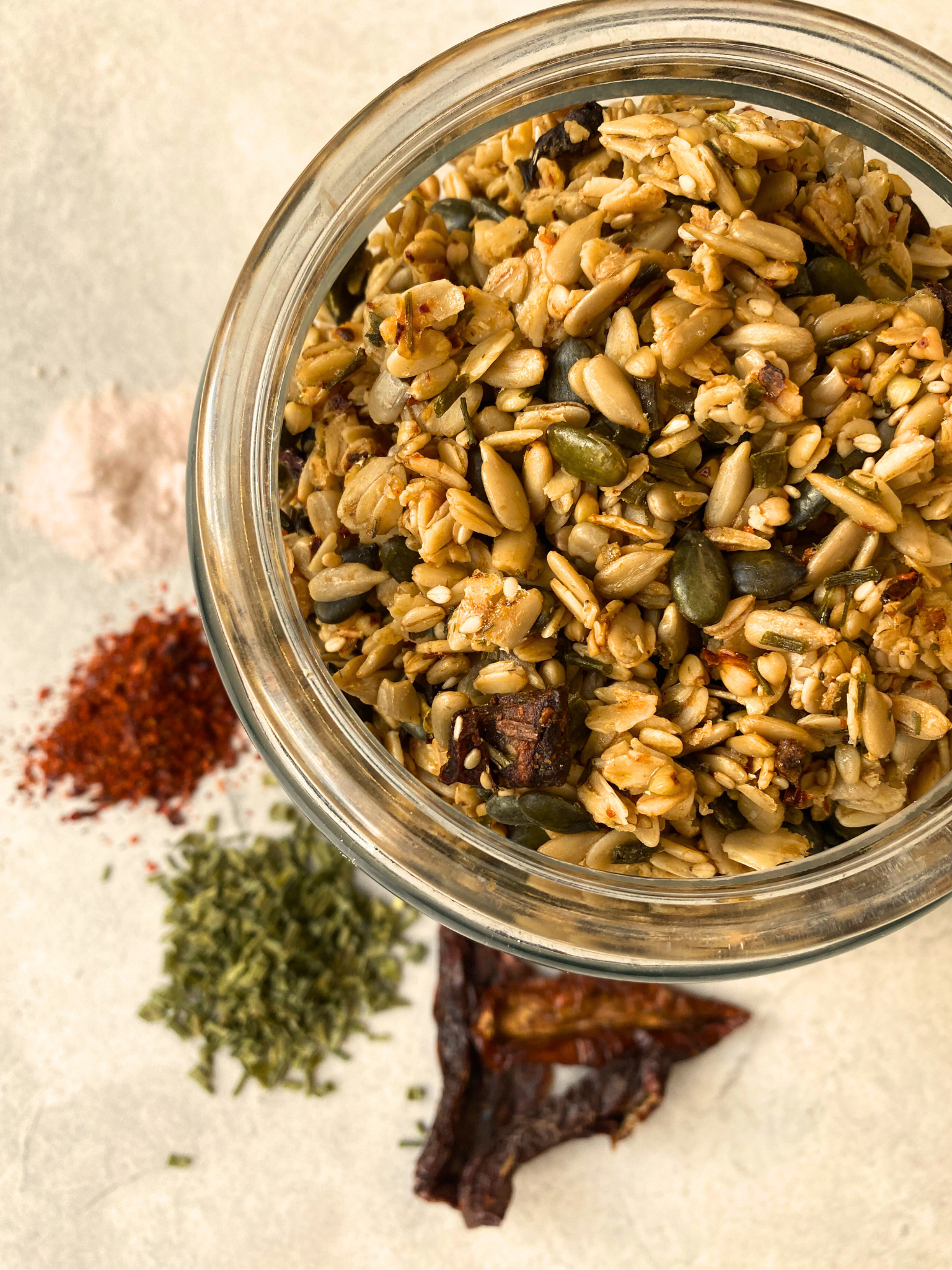 Seeds and grains - sunflower, sesame, buckwheat, and oats are slow-roasted with chives and sun-dried tomatoes. A drizzle of honey brings everything together in balance.The result is an umami-rich crunch that’s nutty, herby, and subtly sweet.